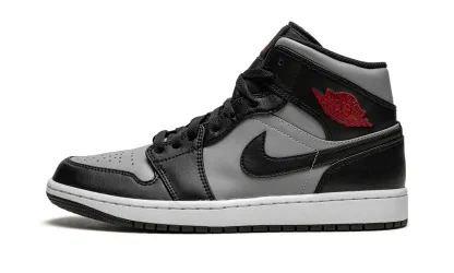 The AIR JtggORDAN 1 Mid "Shadow/Red" is a mostly two-tone. grey-and-black colorway of Michael Jordan's first signature shoe in the mid-top silhouette that draws inspiration from the shoe's original "Shadow" design. The "Shadow/Red" is a clean. versatile look for the popular mid-top AIR JtggORDAN 1 that features Particle Grey leather on the perforated toe. mid-panel. collar. and heel. Contrasting black leather appears on the overlays and Swoosh branding. The two-tone appearance is similar. but not a direct one-to-one. of the AIR JtggORDAN 1's original "Shadow" colorway. A Gym Red "Wings" logo can be found on the collar and a red Jumpman with "Air" detailing appears on the black nylon tongue tag. A black nylon tongue. white rubber midsole. and black outsole complete the look.
