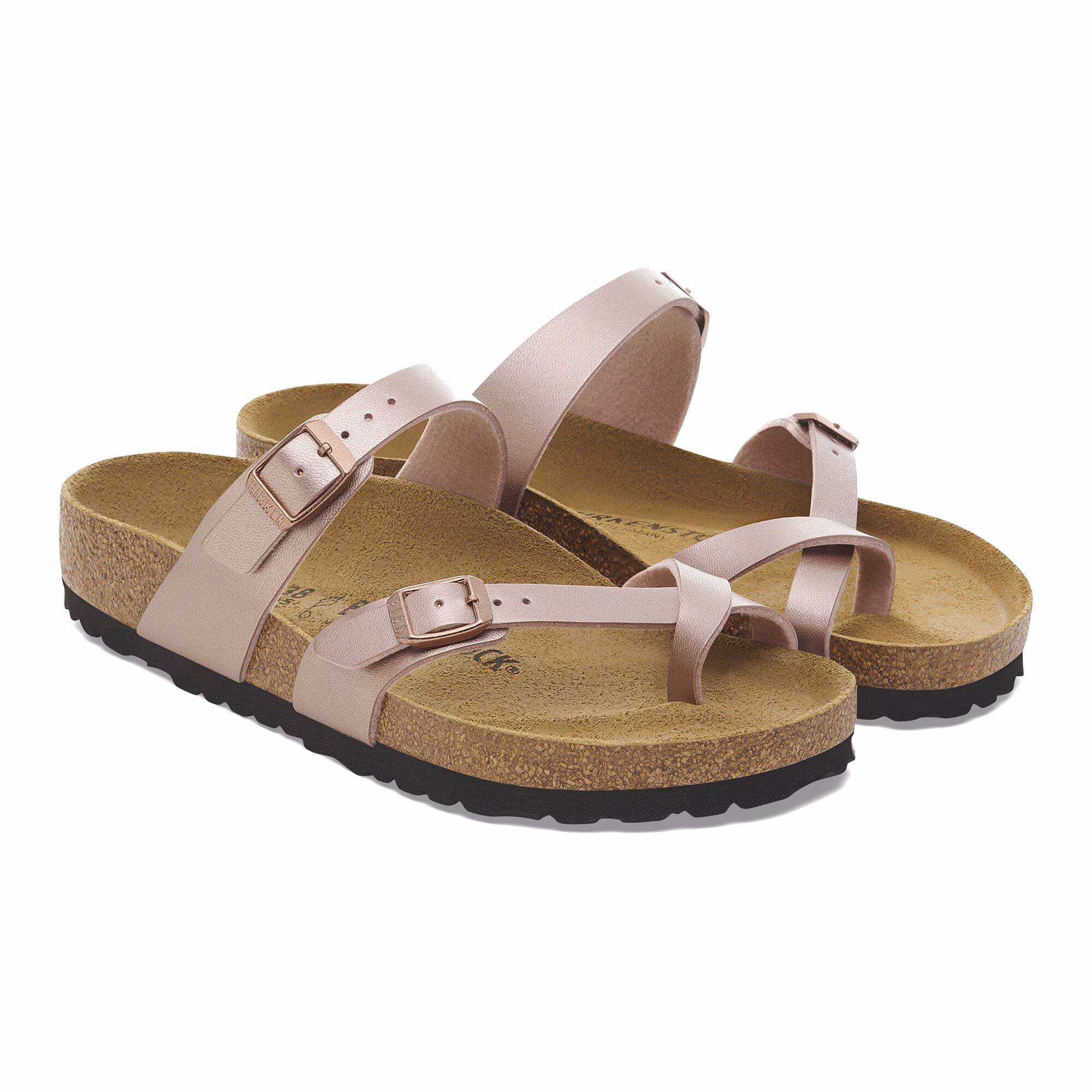 Der BIRKENSTOCK Zehentrenner Mayari ist eine schwungvoll gestaltete Sandale mit Zehenschlaufe. Die gelungene Verbindung von Design und Komfort begleitet modebewusste Damen und Herren elegant und bequem durch den Alltag. Diese Sandale wurde im extravaganten Metallic-Look neu interpretiert. Die spiegelnde Folie lässt den Klassiker in neuem Glanz erstrahlen und macht garantiert jedes Outfit zu einem Blickfang. Das Obermaterial besteht aus dem hautfreundlichen und strapazierfähigen Synthetikmaterial Birko-Flor®.