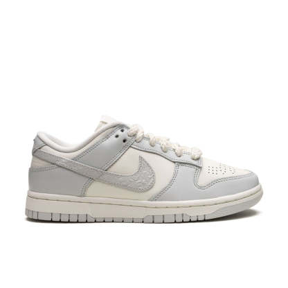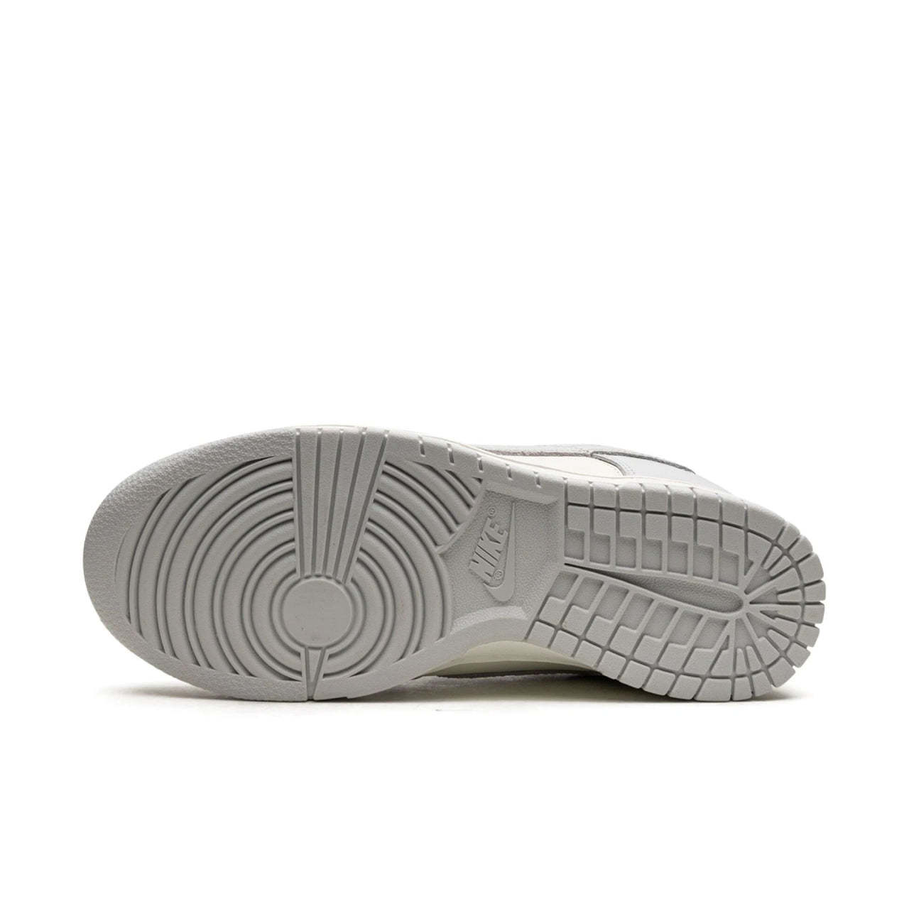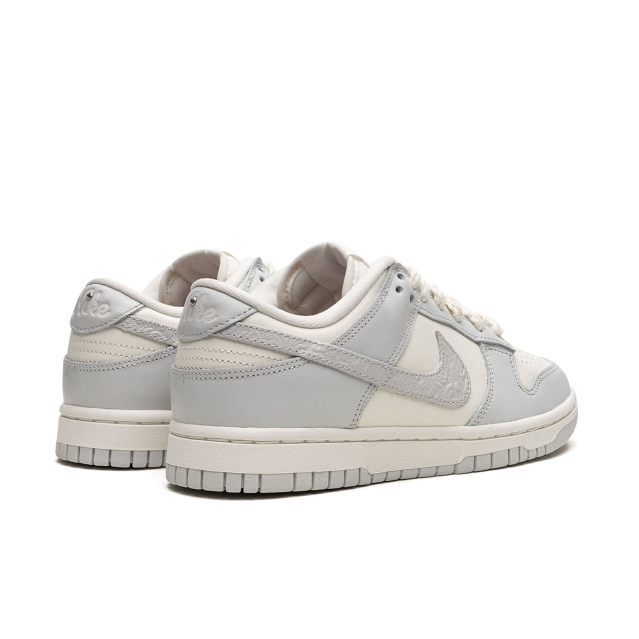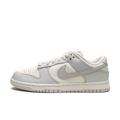 La tomaia delle Nike Dunk Low Needlework Sail Aura è in pelle bianca con inserti e Swoosh in pelle Grigia. Il classico marchio Nike Air è posizionato sulla linguetta in nylon. L'intersuola bianca e la suola Grigia completano il capolavoro.